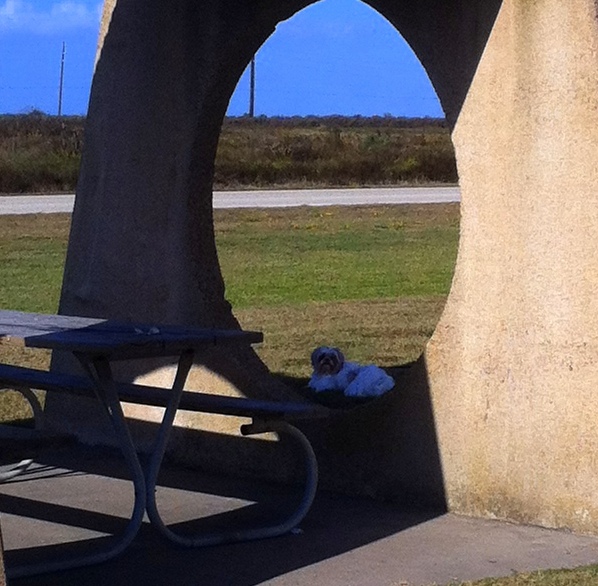 Now you are in my country! It's been awhile since I've been down to Galveston. Makes me a bit homesick. Love the pic of XiShi with the circle of the structure around her. Yes, those blankin' sticker burrs! Owie. Poor baby.